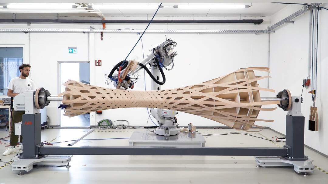 In der Baubranche sind zunehmend ressourceneffiziente Bauweisen gefragt. Additive Fertigungsprozesse ermöglichen, das Material nur dort aufzutragen, wo es tatsächlich notwendig ist. Diese Prozesse sind im Holzbau noch kaum erforscht. Das von Zukunft Bau geförderte Forschungsprojekt 3DWoodWind untersucht beispielsweise additive Auftragsmethoden von Furnierholz-Endlosbändern, um neuartige Leichtbaukonstruktionen zu ermöglichen.