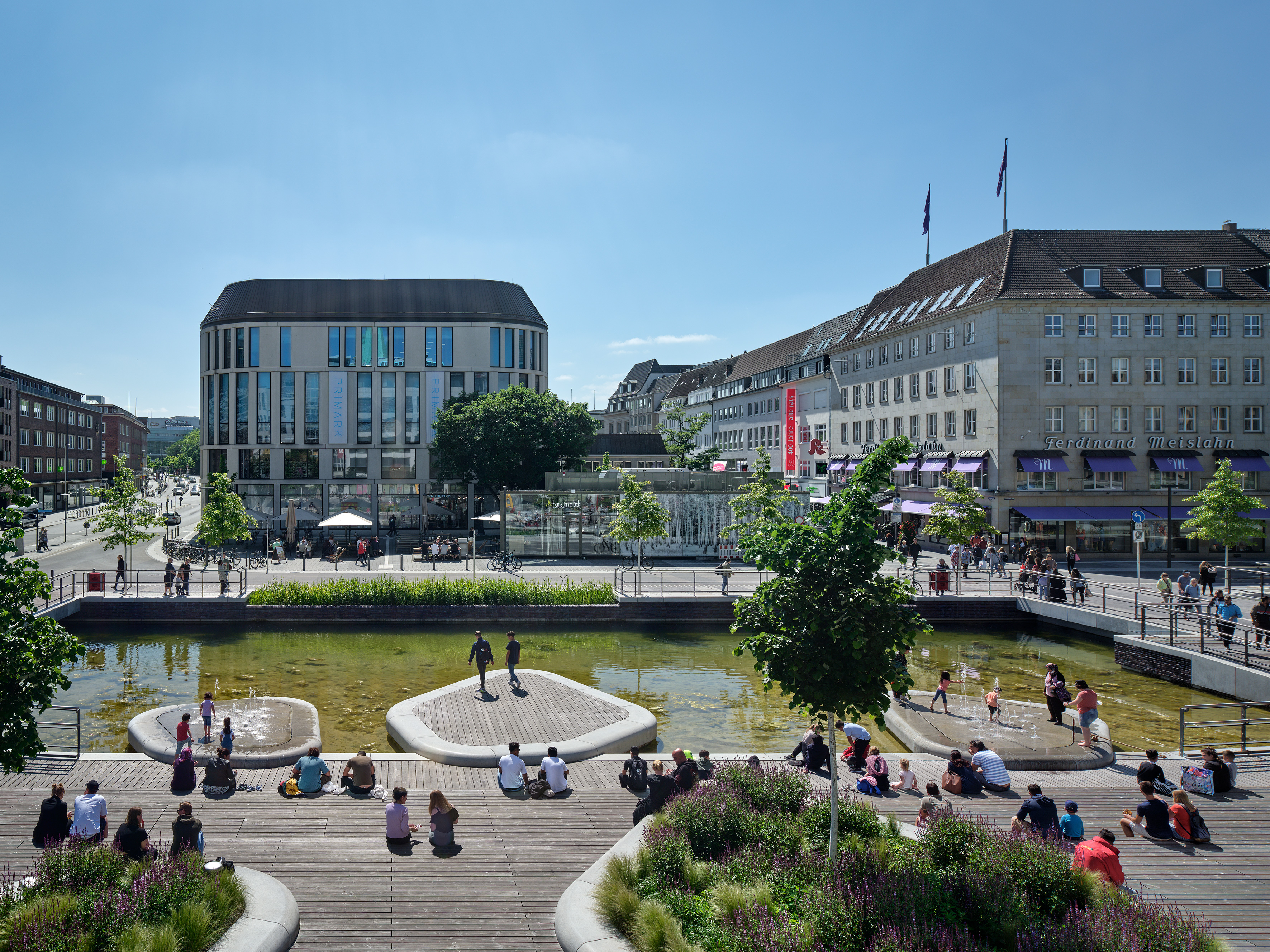 Das Thema „Baukultur und Stadtklima“ ergänzt die Ausstellung und macht damit auf das Sustainable Development Goal 11 „Nachhaltige Städte und Gemeinden“ aufmerksam. Die heißen Sommermonate und das Extremwetter der letzten Jahre stellen Städte zunehmend vor die Herausforderung, klimaresilienter zu werden. Grün- und Wasserflächen zu sichern, zu erweitern oder neu zu schaffen, zählt daher zu den wichtigsten Stadtumbaumaßnahmen. Auf Infotafeln zeigen wir, wie’s gehen kann und stellen „Gute Beispiele“ der Baukultur und der blau-grünen Infrastruktur vor, wie beispielsweise das Holstenfleet in Kiel.