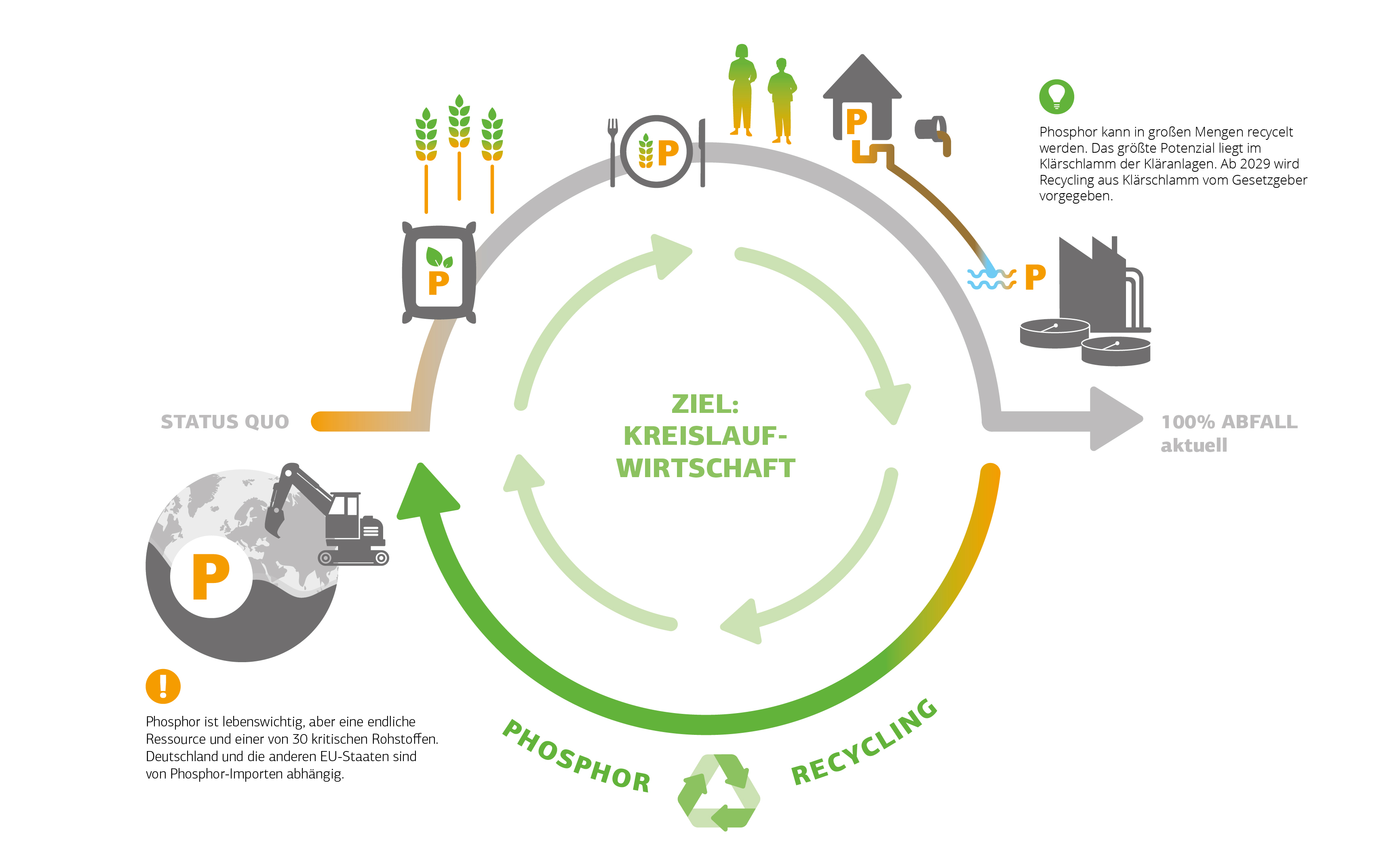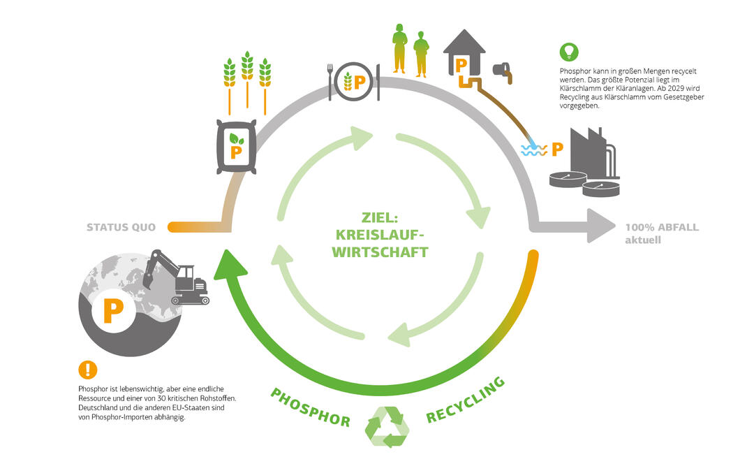 Deutschland ist vollstĂ€ndig von Phosphor-Importen aus zunehmend schadstoffbelasteten LagerstĂ€tten, die oft in geopolitisch unsicheren Regionen liegen, abhĂ€ngig. Daher mĂŒssen deutsche StĂ€dte und Gemeinden ab 2029 Phosphor aus KlĂ€rschlamm selbst rĂŒckgewinnen (§ 3a AbfKlĂ€rV 2017).