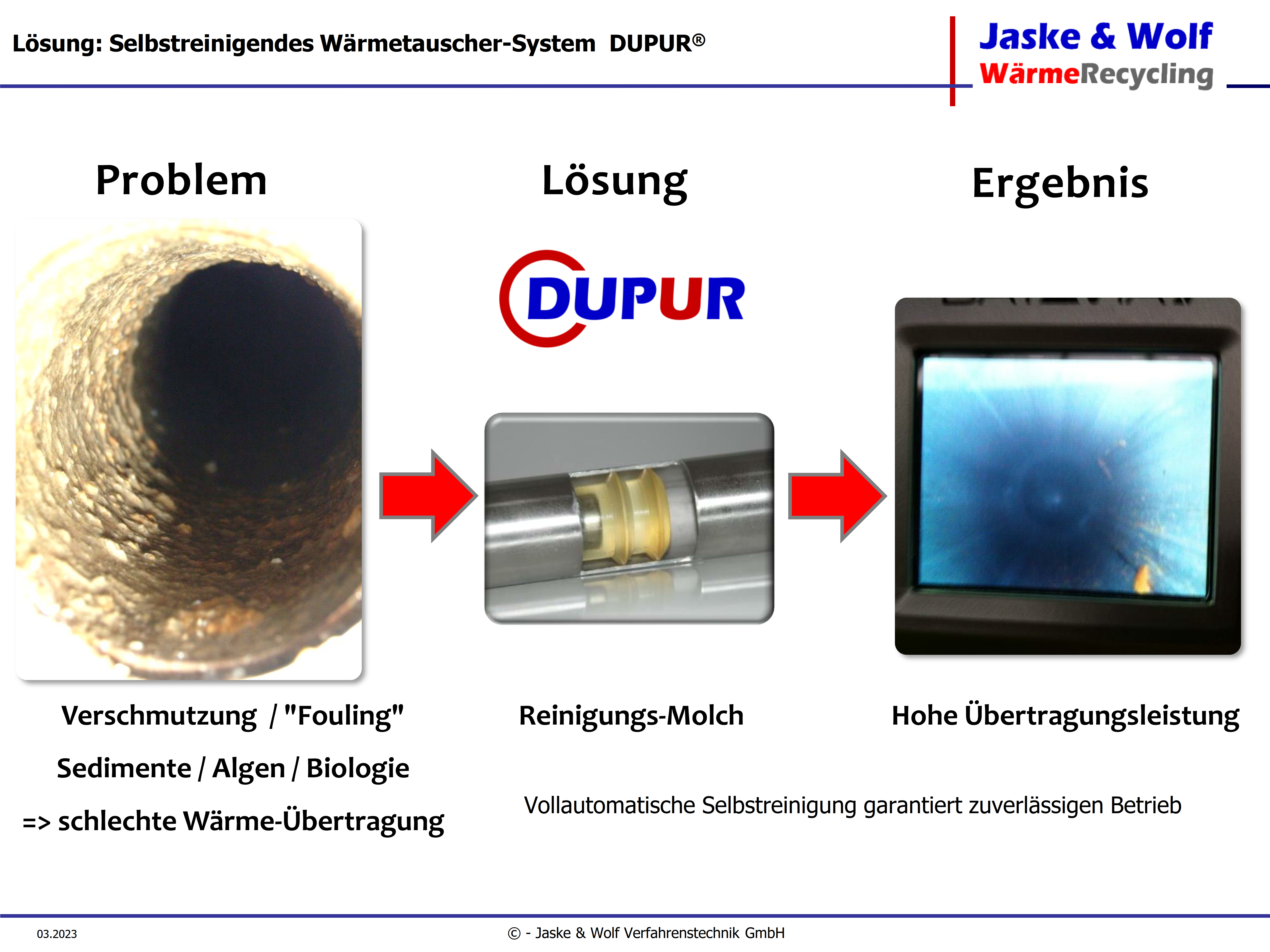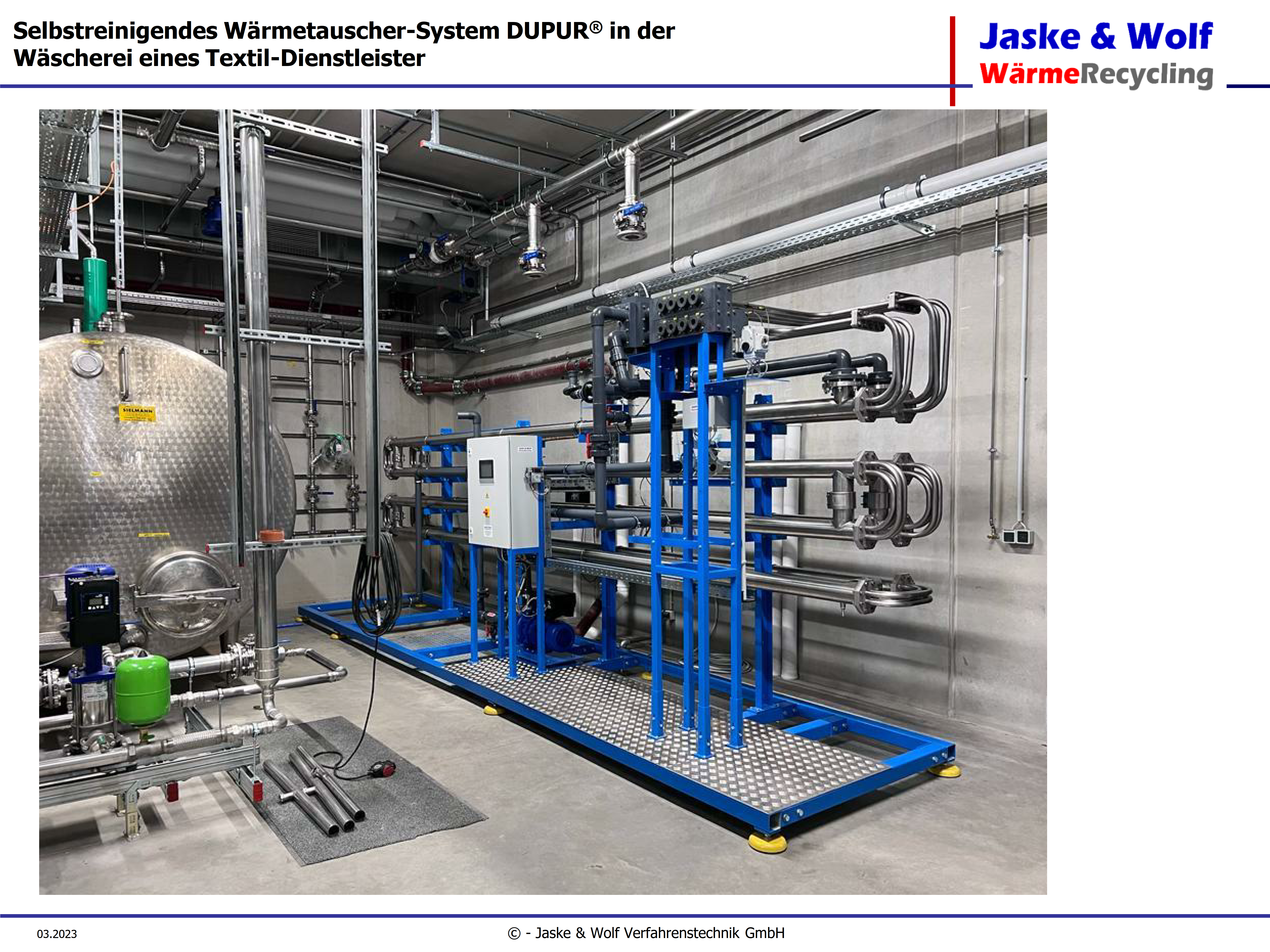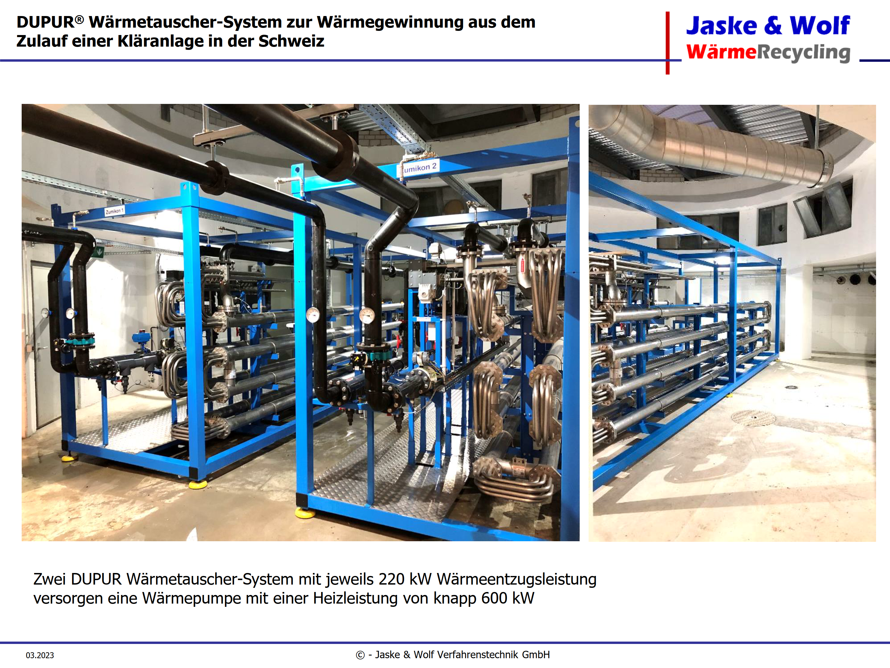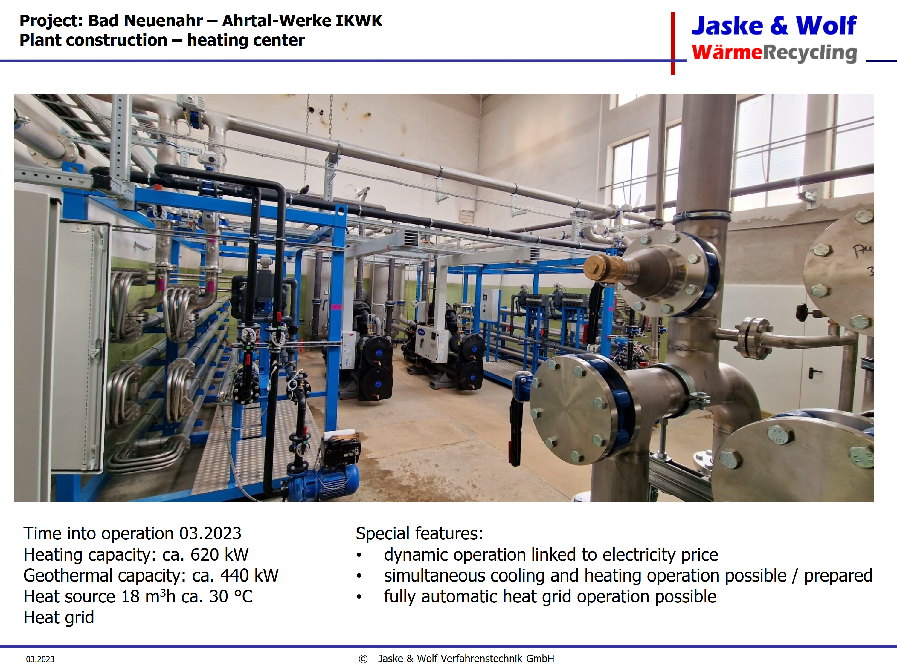 Die Jaske & Wolf Verfahrenstechnik GmbH konzipierte, plante und baute als Generalunternehmer eine schlüsselfertige Heizzentrale für die Ahrtal-Werke. Hierfür kommt als Hauptkomponente ein Wärmetauscher-System zum Einsatz, das speziell für Geothermie, Abwasser, Seen und Kläranlagen entwickelt wurde. Es verfügt über eine hocheffiziente Reinigungsautomatik.