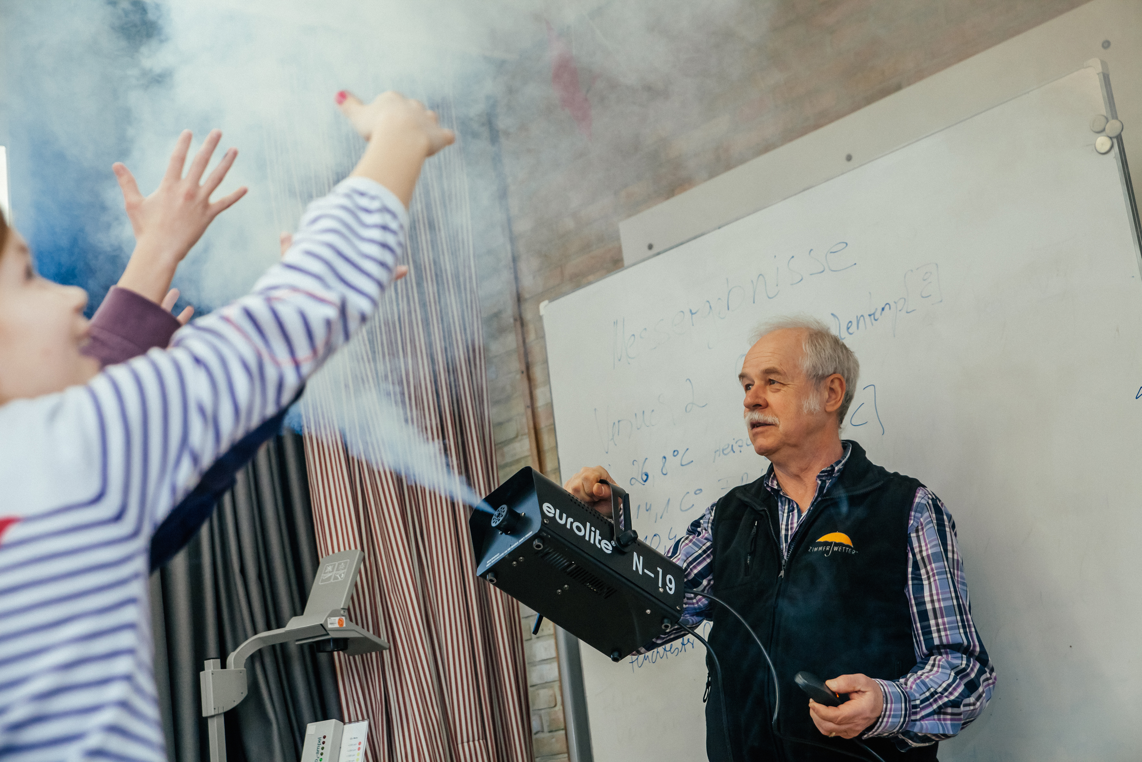 Im Zimmerwetter-Schul-Projekt (DBU-Förderung 2012-2015) bringen geschulte Zimmerwetter-Profis 10-12-jährigen Schulkindern in einer Unterrichtseinheit das bedarfsgerechte Lüften und Heizen mit Messungen, Experimenten, Nebelzauber und viel Spaß näher. In den allgemeinbildenden Schulen erreicht das Projekt Kinder aus unterschiedlichsten sozialen Verhältnissen. Wie eine externe Evaluation 2020 ergab, verbessern die Schüler*innen ihre Kompetenz für Heizen und Lüften signifikant. Sie verinnerlichen Ihr Wissen und transportieren es in die eigenen vier Wände. (Phineo-Wirktsiegel 2017)