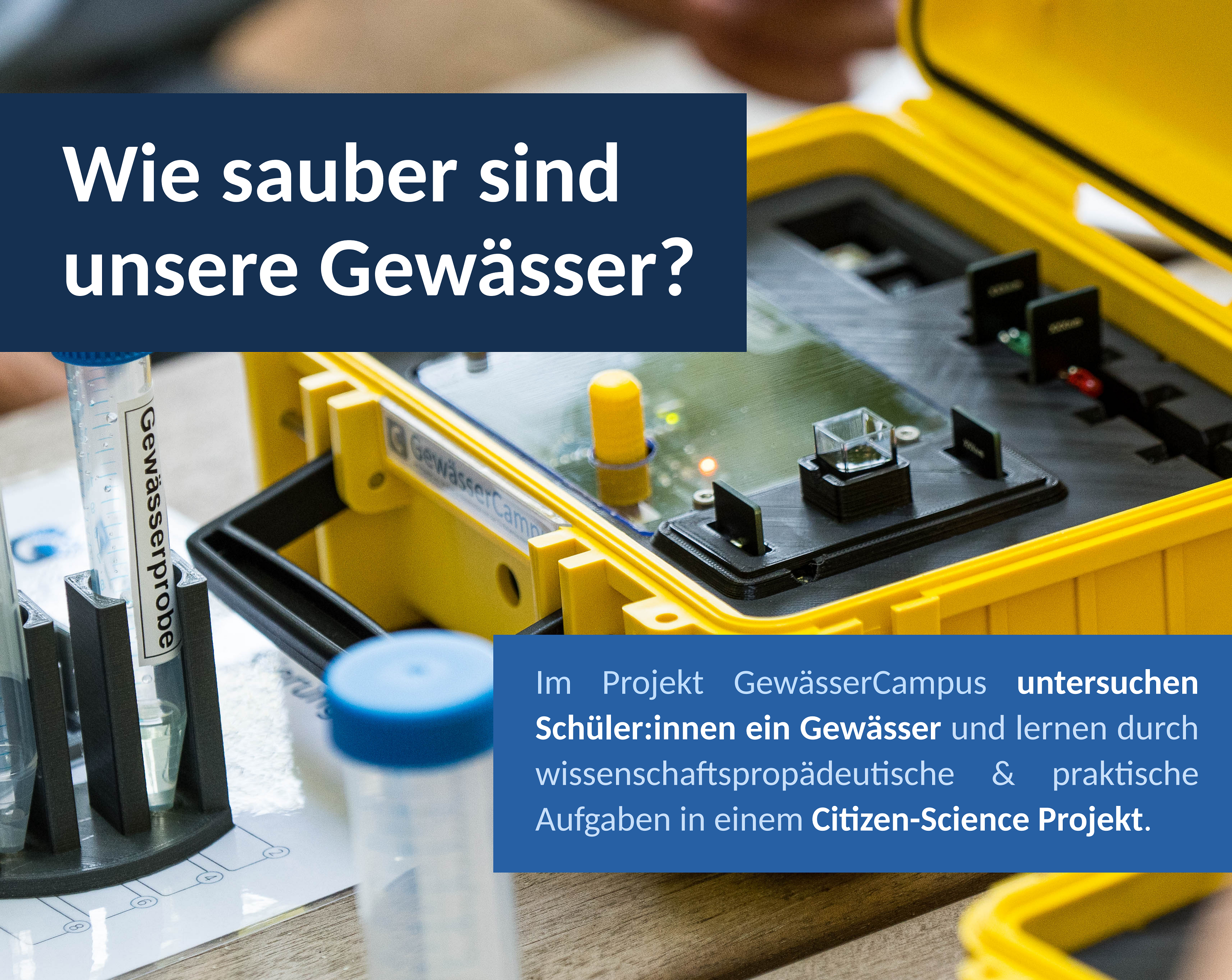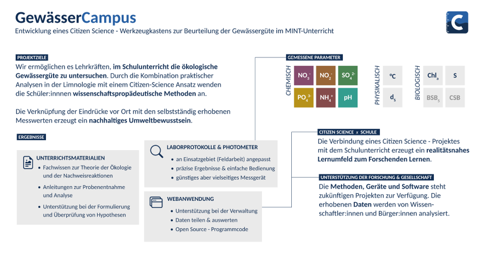 Im Projekt GewässerCampus können Schüler:innen eine photometrische Gewässeranalyse durchführen und die Ergebnisse in einer Webanwendung veröffentlichen und analysieren. Im Zentrum steht dabei die Idee, dass Schüler:innen in direkt am Untersuchungsort durchgeführten Experimenten ein Gewässerprofil erstellen und auswerten. Dabei werden durch die Integration eines Citizen Science-Ansatzes wissenschaftspropädeutische Kompetenzen erworben.