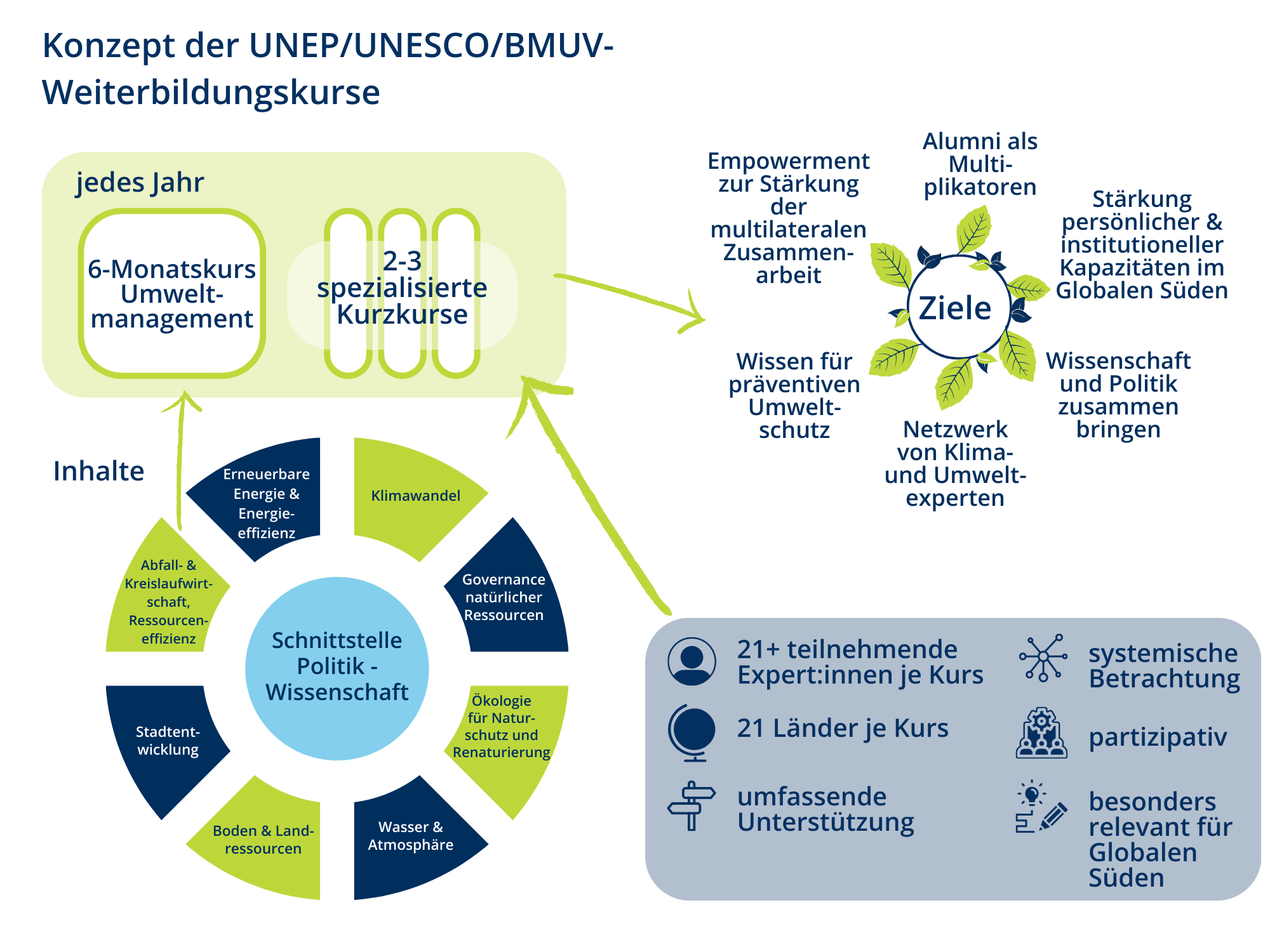 Gemeinsam werden Grundlagenkenntnisse erweitert, Lösungsansätze für die lokale bis internationale Ebene besprochen und an konkreten Fällen erörtert. Viele Anregungen kommen darüber hinaus aus zahlreichen Fachexkursionen. Der intensive Austausch untereinander – auch nach Kursende – hilft über kulturelle Barrieren hinweg dringende Umweltprobleme gemeinsam zu lösen und unsere Lebensgrundlagen zu schützen. Das Kursprogramm wird dabei vom Bundesumweltministerium, UNEP und UNESCO unterstützt.