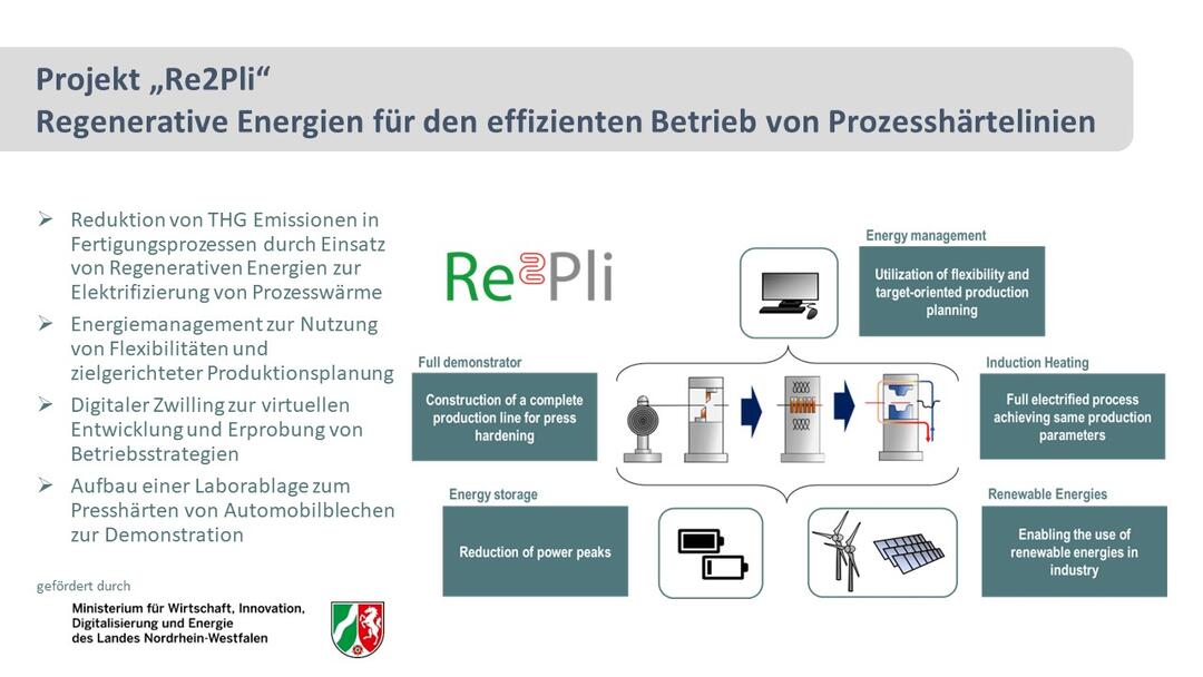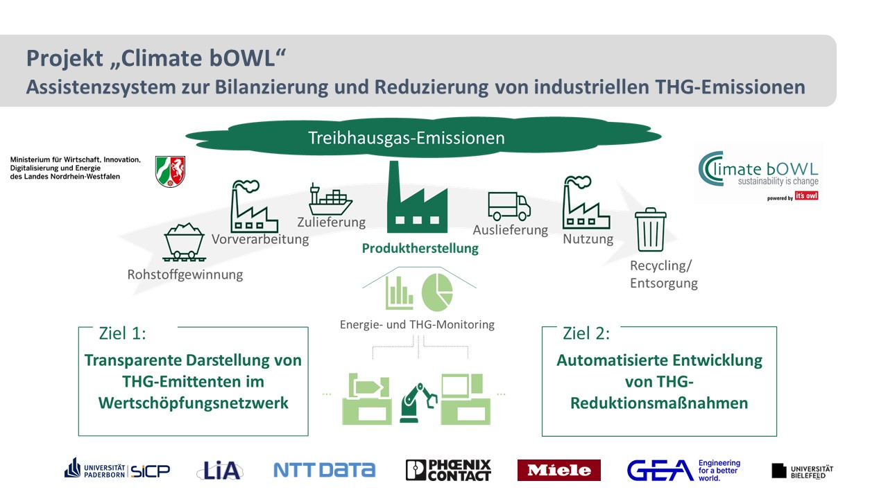 Im Zuge einer nachhaltigen Transformation haben viele Industrieunternehmen ambitionierte Emissionsminderungsziele. Zur Zielerreichung bedarf es ganzheitlicher Ansätze, um ausgehend vom Energiebedarf und der Prozessanforderung eine optimale Kombination grüner Technologien zu identifizieren. Neben mehr Energieeffizienz und erneuerbarer Energie ist es essenziell, gewinnbringende Elektrifizierungspotentiale auszuschöpfen und Flexibilisierungsoptionen zu schaffen, wobei grüner Wasserstoff gezielt die verbleibenden Bedarfe deckt. Der Kreis Paderborn, in dem die Stromerzeugung durch regenerative Energien dominiert wird und viele produzierende Unternehmen Konzepte nachhaltigen Wirtschaftens umsetzen, ist für die Umsetzung der Energiewende in der Industrie eine ideale Kulisse. Bisher wurden einzelne Lösungen für Teilaspekte in Verbundprojekten demonstriert. Der Grundsatz der ganzheitlichen Entwicklung von CO2e-Neutralitätsstrategien beginnend von den Prozessbedarfen wird im Projekt Climate bOWL verfolgt. Neben der Wärmerückgewinnung ist die Elektrifizierung von mit fossilem Gas betriebenen Prozessen, wie sie im Projekt Re²Pli am Beispiel von Härteprozessen in KMU erprobt werden, ein wesentlicher Bestand. Die im Projekt Schlafender Riese angestrebte Bereitstellung von grünem Wasserstoff als Energieträger im Hochtemperaturbereich ist ein weiteres Puzzleteil. Nicht-vermeidbare Abwärme aus Industrieprozessen dient anschließend insbesondere als Baustein der kommunalen Wärmeversorgung. Die Partner Westfalen Weser, BENTELER und die Universität Paderborn verknüpfen die verschiedenen Verbundprojekte. Die Innovation liegt dabei in der ganzheitlichen Betrachtung der Bausteine Energieeffizienz, Elektrifizierung und Nutzung von Grünem Wasserstoff, um kosten- und energieeffizient eine CO2e-neutrale Produktion zu realisieren. Am Beispiel der vielseitigen Industrielandschaft in Paderborn präsentieren die Kooperationspartner eine Blaupause für nachhaltige, regionale Wertschöpfungsketten.